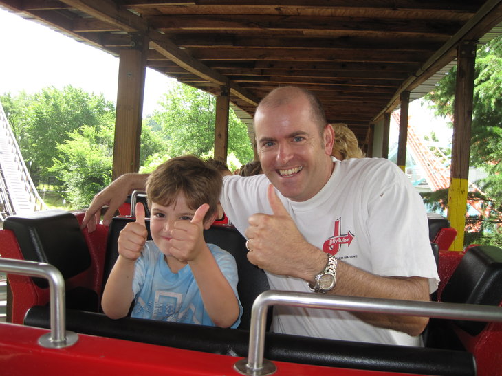 Kelly sat with Hallie in the car in front of Travis and me. We cranked up the first hill and soon began our second fiesty ride of the day. Travis’s eyes were wide as he gripped the handle, the ground rushing by as we tilted through turns. The Goldrusher hasn’t lost a step in its old age: it was just as much fun as it was 25 years ago! Kelly emerged with a smiling Hallie, and even Travis gave it thumbs-up as we exited the car.