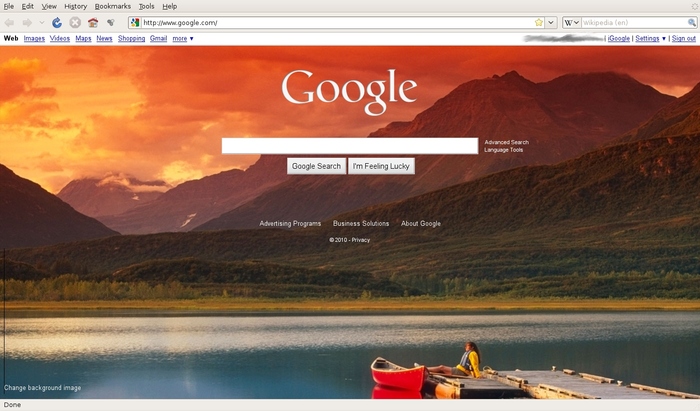 Looks like Google realized that some of its users prefer the plain-Jane Google page rather than the Bing Bling version, and now there’s an option to remove the background image. Simply click on the lower left link for “Remove background image” and you’ll have the familiar Google-on-white-background page you’re familiar with.