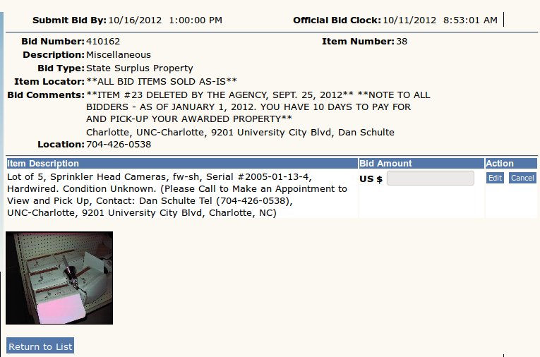 Yesterday I checked the State Surplus Property Office’s auction site, looking for audio equipment for Little Raleigh Radio. I didn’t find any audio gear but I did find something unusual up for bid: a lot of sprinkler head cameras put on the block by UNC Charlotte.