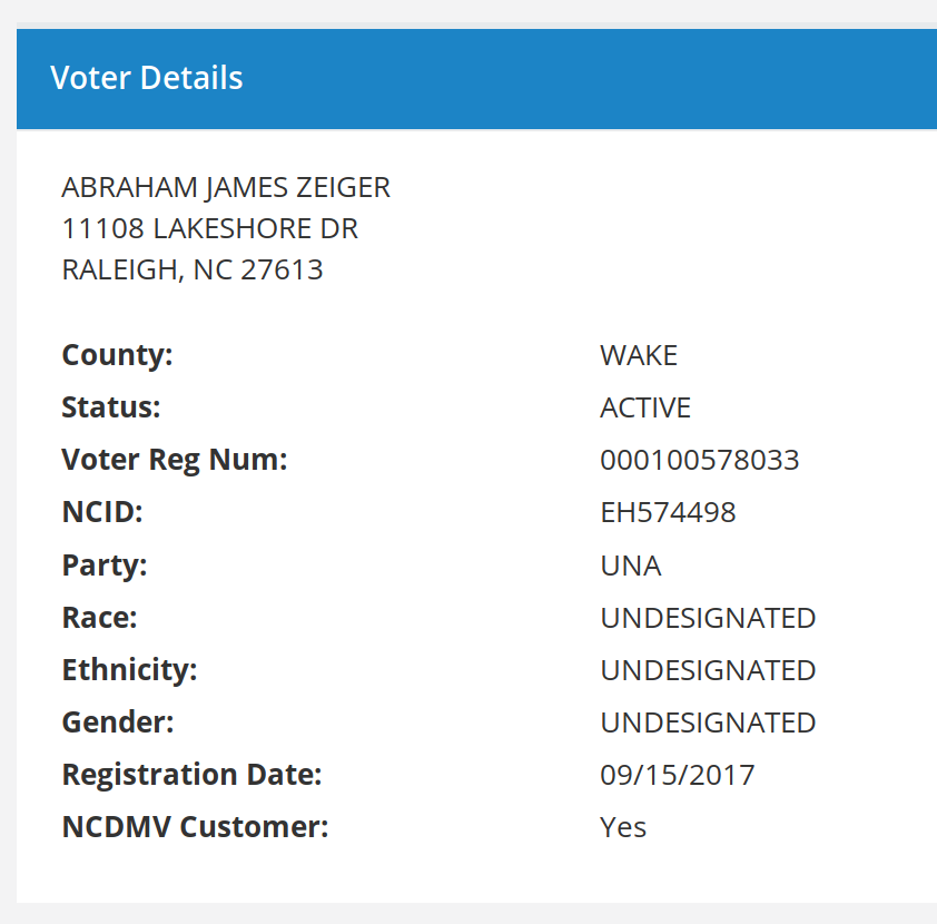 First up was a search through voter records. An Abraham James Zeiger is registered in 2017 as Unaffiliated and has no voter history. Not much luck here: